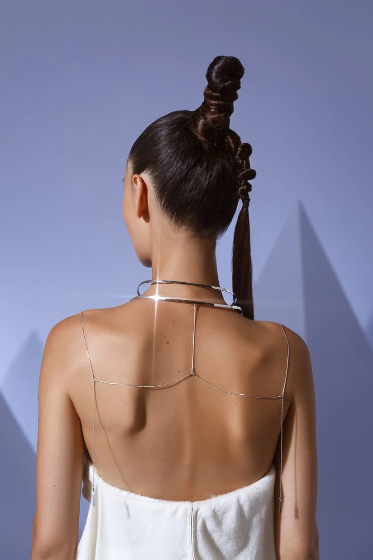 Stand out in shimmering style with our silver unique body necklace—handcrafted sterling chains contour curves, hypoallergenic, perfect festival to evening glam.